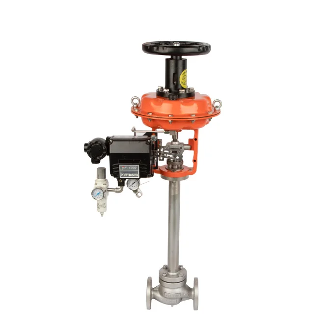 The pneumatic diaphragm low-temperature regulating valve is a regulating valve used in low-temperature and deep-cold occasions. It adopts a long-necked valve cover for heat preservation, and the valve seat leakage meets the ANS standard. The regulating valve is equipped with a multi-spring diaphragm actuator, which has a compact structure and large output force. The valve body adopts a precision cast angle structure, and the material is aluminum alloy, which has good low-temperature resistance. The double seal of the bellows seal and the packing ensures that the regulating valve does not leak in low-temperature occasions and effectively prevents frost on the outside of the valve. The valve is particularly suitable for accurately controlling the process parameters of cryogenic gases and fluids (such as liquid oxygen, liquid argon, etc.) to maintain them at a given value.